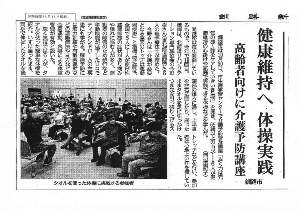 10月30日に釧路市生涯学習センターで開催された、介護予防普及講座「歩く力は原基の源 ~膝をケアしていきいき生活」に当院の理学療法士6名が講師として参加し、北海道新聞・釧路新聞に掲載されました