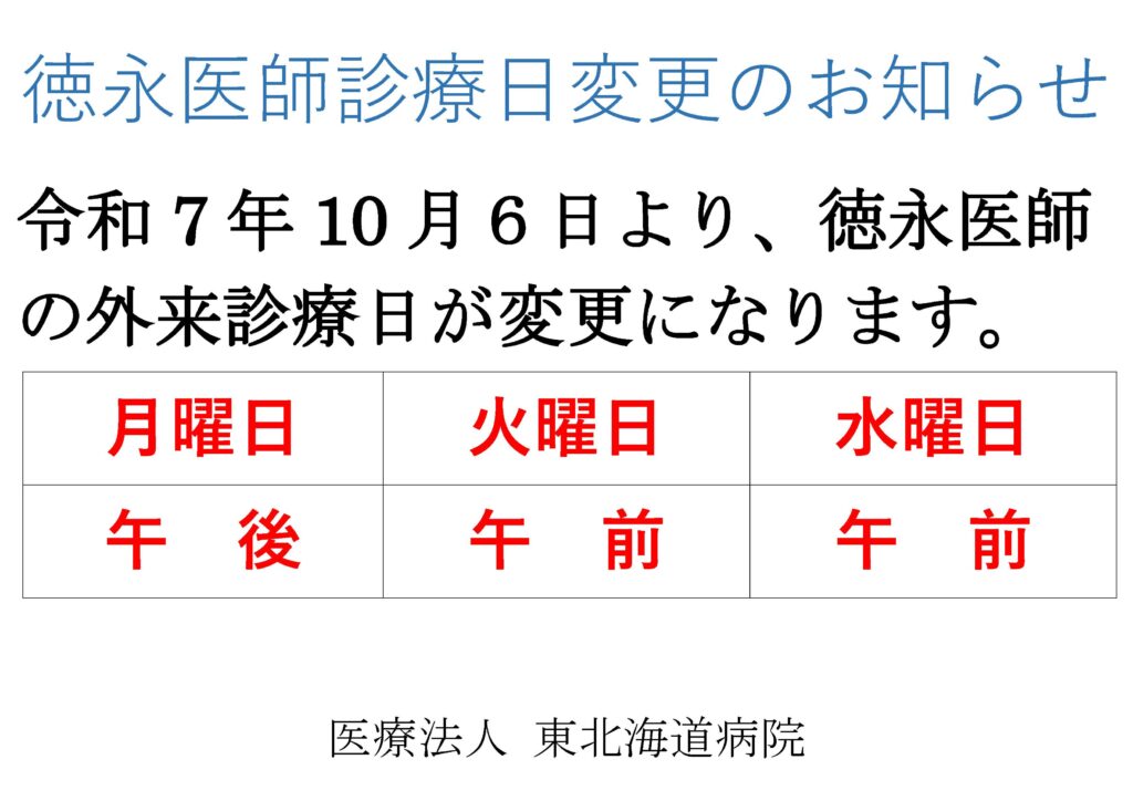 徳永医師診療日変更のお知らせ 2025/9/22 お知らせ, 診療案内 令和7年10月より、徳永医師の外来診療日が下記に変更になります。 月曜日 火曜日 水曜日 午 後 午 前 午 前 診察の際に次回予約日をお伺いいたしますので、事前にご確認ください。