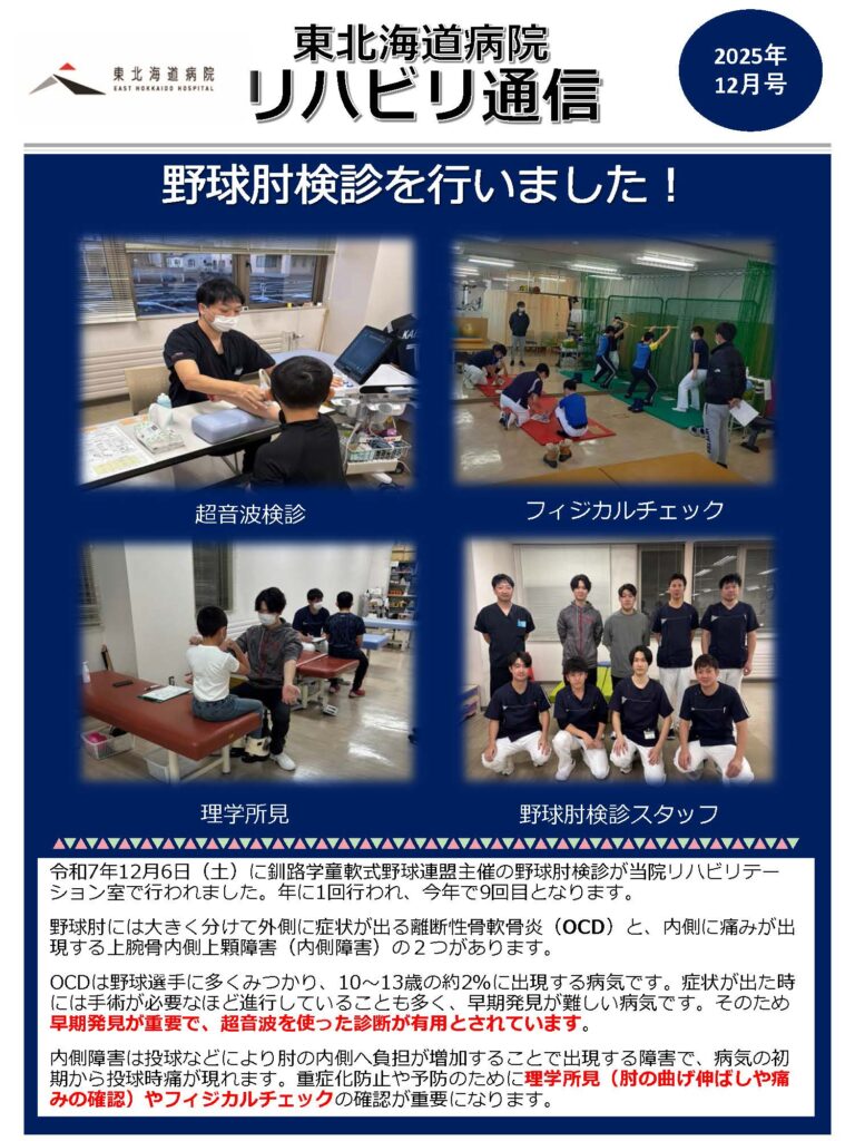 令和7年12月6日(土)に釧路学童軟式野球連盟主催の野球肘検診が当院リハビリテーション室で行われました。年に1回行われ、今年で9回目となります。